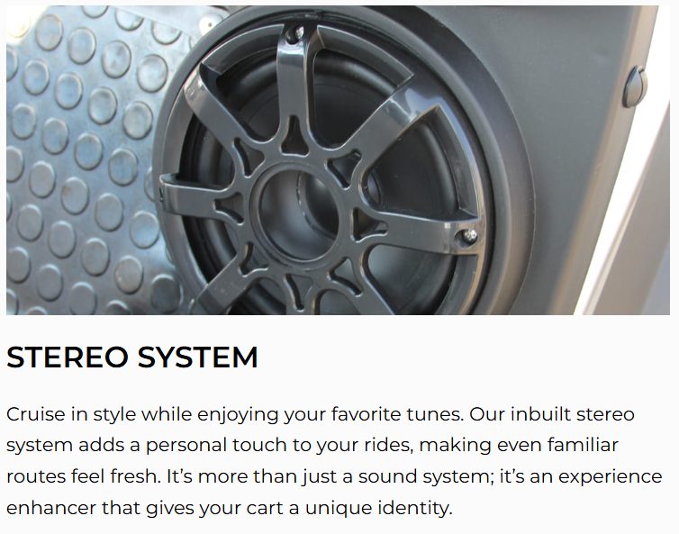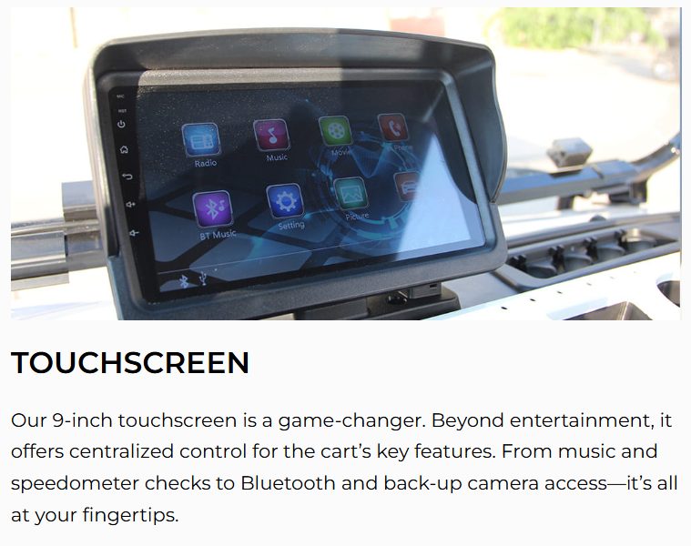 Inside, you’ll find two-tone luxury seating, a color-matched dash with cup holders and phone slot, and a 9” touchscreen display with Bluetooth, speedometer, backup camera, and multimedia controls. The 14” aluminum wheels with radial DOT tires offer a smooth, street-legal ride. The LSV package—including MSO, VIN, DOT windshield, reflectors, and license plate light—makes it ready for the road in compliant neighborhoods.