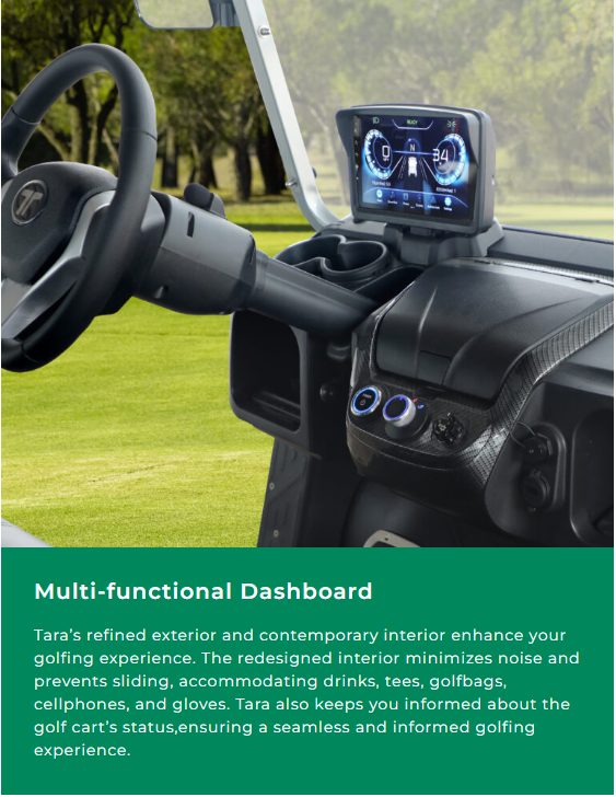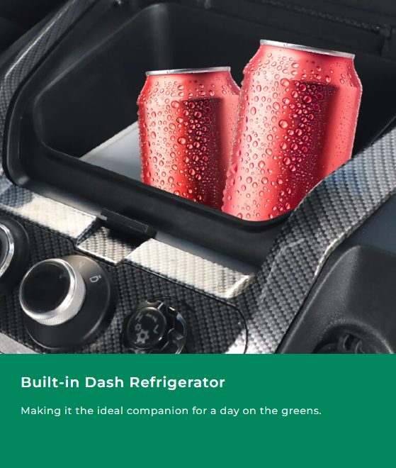 Inside, passengers will enjoy the 9” touchscreen with CarPlay, a built-in refrigerator, illuminated speakers, and a multi-functional dashboard with a golf ball and tee holder. A rear armrest with storage, adjustable steering column, and optional golf bag holder kit complete this versatile package. Finished with 14” aluminum wheels and silent off-road tires, the Explorer is available in stunning colors like Flamenco Red, Pearl White, and Arctic Gray.