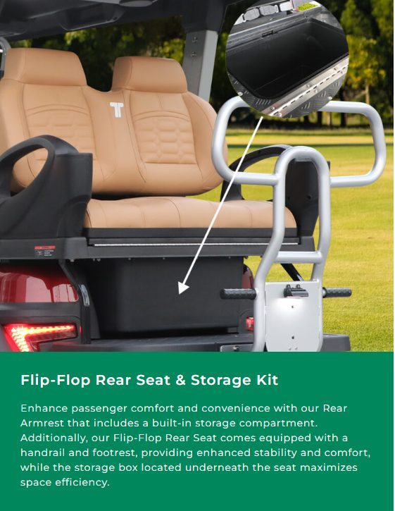 Inside, passengers will enjoy the 9” touchscreen with CarPlay, a built-in refrigerator, illuminated speakers, and a multi-functional dashboard with a golf ball and tee holder. A rear armrest with storage, adjustable steering column, and optional golf bag holder kit complete this versatile package. Finished with 14” aluminum wheels and silent off-road tires, the Explorer is available in stunning colors like Flamenco Red, Pearl White, and Arctic Gray.