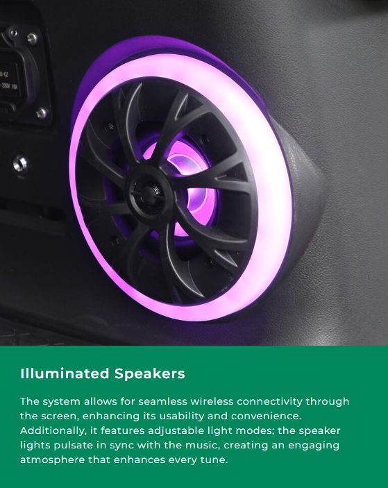 Inside, passengers will enjoy the 9” touchscreen with CarPlay, a built-in refrigerator, illuminated speakers, and a multi-functional dashboard with a golf ball and tee holder. A rear armrest with storage, adjustable steering column, and optional golf bag holder kit complete this versatile package. Finished with 14” aluminum wheels and silent off-road tires, the Explorer is available in stunning colors like Flamenco Red, Pearl White, and Arctic Gray.