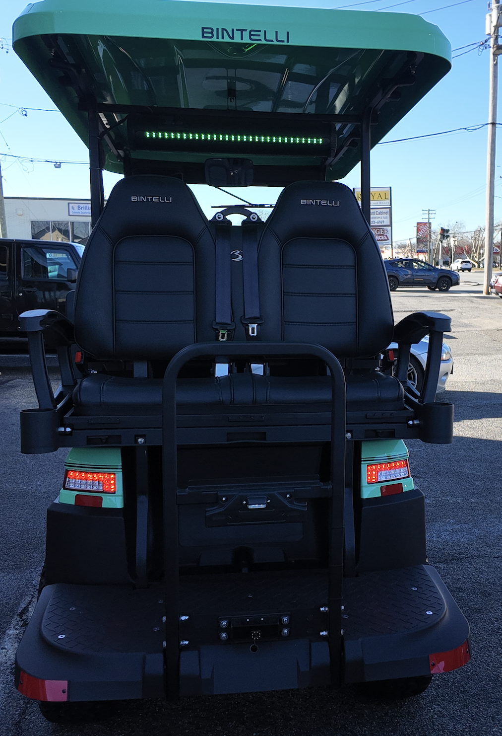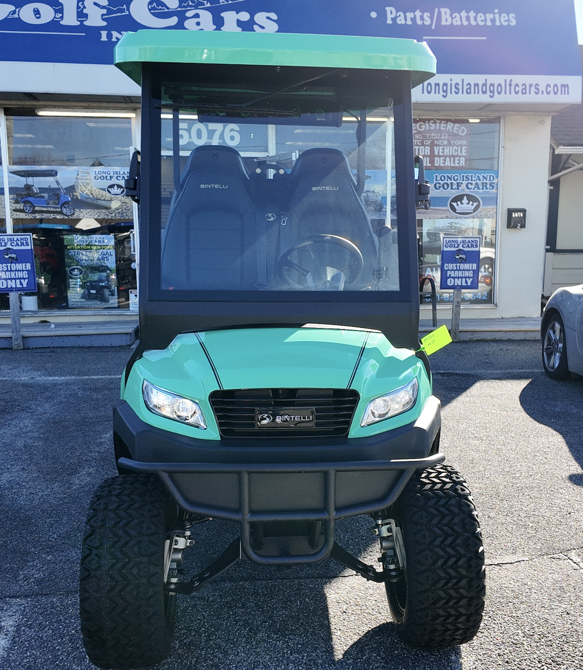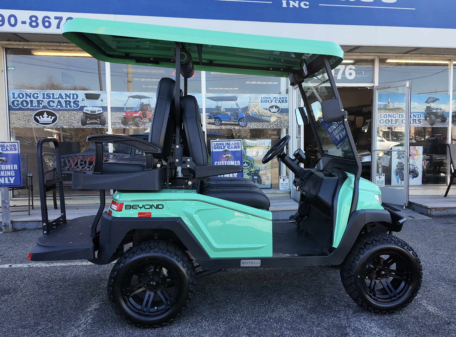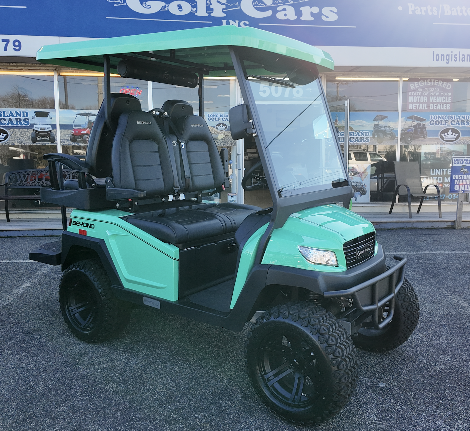 This Bintelli Beyond Lifted 4PR street legal golf cart is the newest addition to the Bintelli fleet and it is FULLY loaded! Complete with an aluminum frame, aluminum roof supports, AC motor, LED lighting, 23″ tires, a Bluetooth sound system, reverse camera, hydraulic disc brakes, two-tone premium seats, on-board smart charger, dual USB plugs, extended roof, rear flip seat, head lights, tail lights, turn signals, DOT windshield with wiper, DOT tires, DOT 3-point seat belts, and 105 AH Lithium Battery!